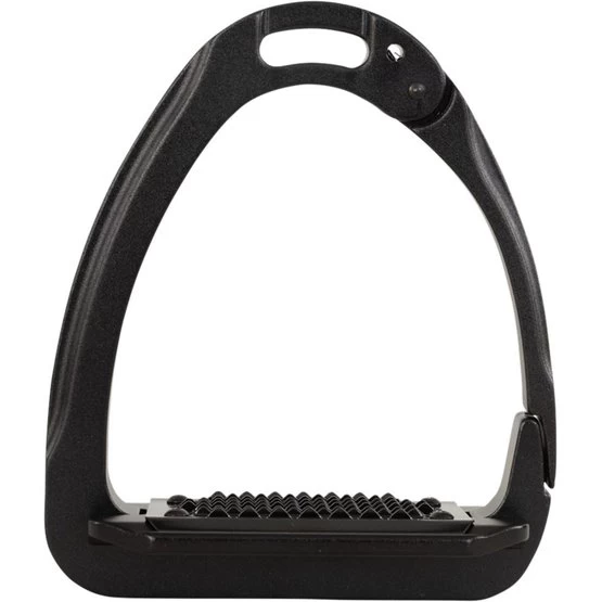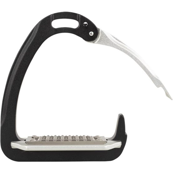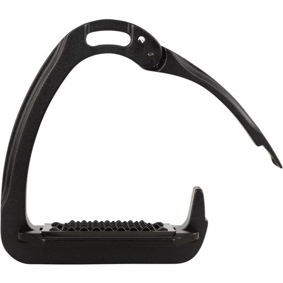 Die breite rutschfeste Steigbügelsohle aus Edelstahl hat ein grobes Profil und extra lange Löcher für den Abfluss von Sand und Wasser. Die Steigbügelsohle ist leicht geneigt, um die Ferse unten zu halten. Die abgeschrägte Steigbügelriemenaufhängung sorgt für eine gute Steigbügelposition und hält den Fuß in der richtigen Position. Dies gibt dem Reiter mehr Stabilität und verbessert die Beinposition.