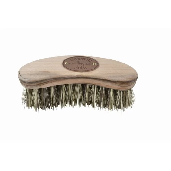 Bananenförmige Buchenholzbürste mit Polypropylen (PP)-Fasern. Starke 50-mm-Borsten, ideal für die tägliche Pflege.