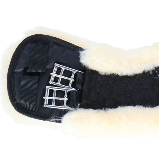 Anatomisch geformter, halbrunder Dressurgurt mit medizinischem Lammfell. Dieser halbrunder Dressurgurt bietet den Vorderbeinen mehr Bewegungsfreiheit. Der Gurt wird empfohlen für Pferde bei den der Gurt sich von Natur in der Nähe der Vorderbeine befindet, sodass Hautschäden vermieden werden können. Mit Edelstahlschnallen und einem D-Ring, der das Befestigen von Hilfszügeln ermöglicht. Um die natürlichen Eigenschaften des Lammfells zu erhalten, empfehlen wir, das Produkt bei 30°C mit einem speziellen Lederwaschmittel zu waschen.