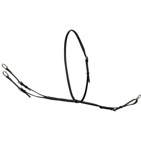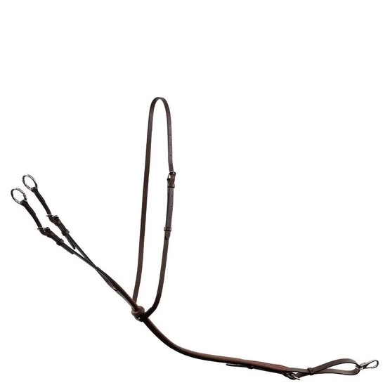 Ledermartingal mit versilberten Messingschnallen. Das Martingal, das in der Regel beim Springen verwendet wird, verhindert das Pferd den Kopf über ein vorgegebene Maß zu heben. Außerdem sorgt das Martingal für einen Winkel in den Zügeln, wenn das Pferd trotzdem den Kopf hebt. Dadurch kann das Gebiss abwärts einwirken auf die Laden statt auf die weniger empfindlichen Maulwinkel. Für besonderen Komfort ist das Martingal weich gefüttert, zudem sind die Zügelringe mit speziellen Clips versehen. Diese runden Clips öffnen sich nach innen und erleichtern es, Zügel festzumachen oder zu entfernen, ohne dass die Gefahr besteht, dass sich die Zügel zu unerwünschten Zeitpunkten lösen. Aus europäischem Leder. Mit Martingalstoppern aus Gummi.