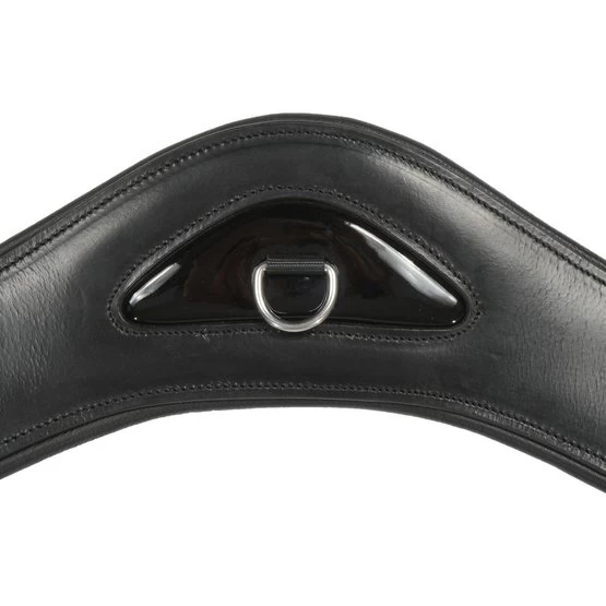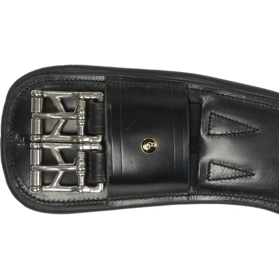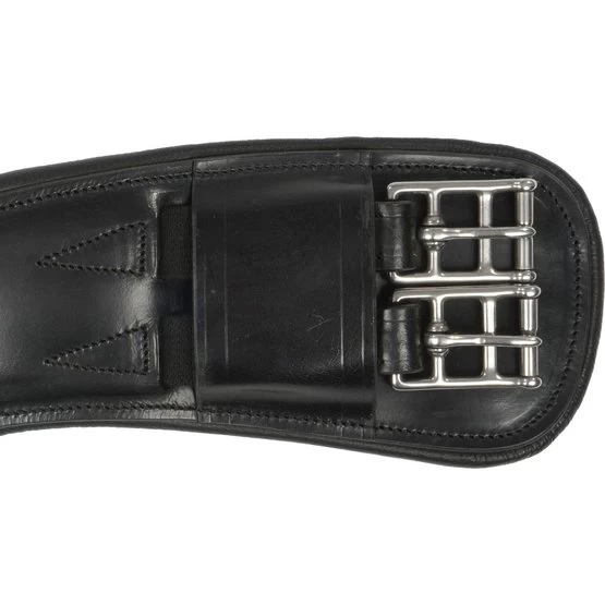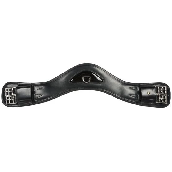 Anatomisch geformter Lederdressurgurt. Aufgrund der anatomischen Form wird das Pferd nicht in seinen Bewegungen behindert. Der Gurt ist beidseitig mit einem Gummizug versehen, der nicht nur für das Pferd angenehm ist, sondern auch das Aufrichten erleichtert. Mit dem kleinen Gurt in der Gurtmitte können Sie schnell und einfach einen Hilfsriegel befestigen oder lösen. Der D-Ring ist einfach, wenn Sie eine Hilfsschiene mit einem Musketen verwenden. Der Montageort ist mit Lackleder bezogen. Der Gurt hat Rollschnallen aus Edelstahl und breite Lederschlaufen auf beiden Seiten, um die Gurte sauber zu halten.
