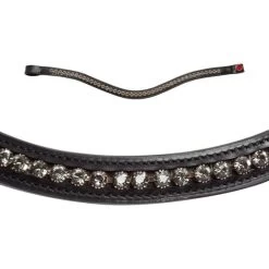 Breites, schwedisches Reithalfter (± 4 cm) mit Lackleder. Das Reithalfter hat ein symmetrisches Design, ist weich unterlegt, rund bombiert und hat ein weich unterlegtes Kinnstück. Mit runden, glänzend silberfarbigen Schnallen.