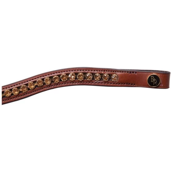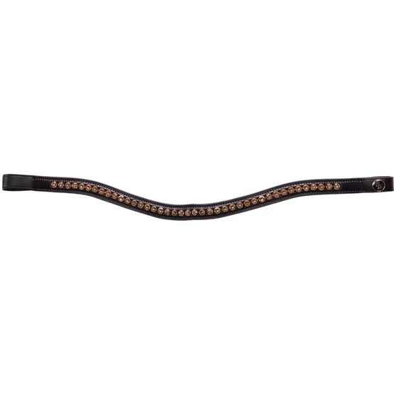 Geschwungenes Stirnband, mit SWAROVSKI ELEMENTS 127308. Die Größen mit einer Zufügung -SC (Split Crown) sind für Zaumzeug mit einem geteilten Kopfteil geeignet. Das Stirnband hat breite Riemen und zwei Lederschlaufen, um die Gurte zu scheiden.