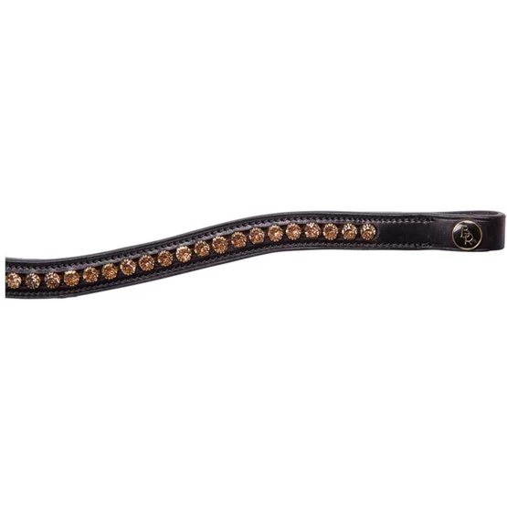 Geschwungenes Stirnband, mit SWAROVSKI ELEMENTS 127308. Die Größen mit einer Zufügung -SC (Split Crown) sind für Zaumzeug mit einem geteilten Kopfteil geeignet. Das Stirnband hat breite Riemen und zwei Lederschlaufen, um die Gurte zu scheiden.