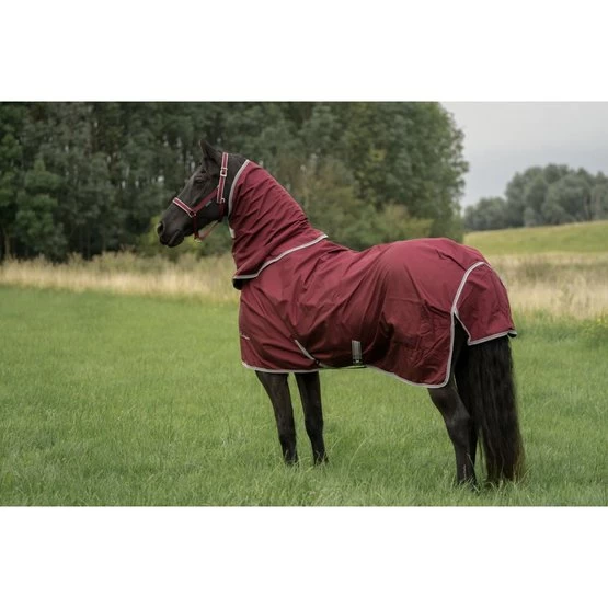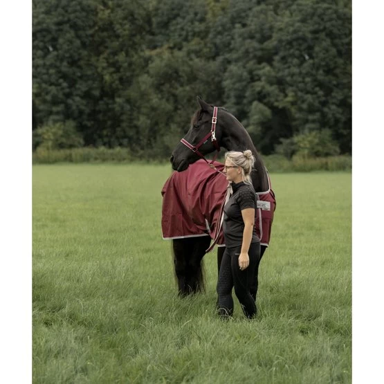 Die Schulterfalten mit glattem Nylonfutter geben dem Pferd viel Bewegungsfreiheit. Der Click’n Go-Verschluss mit Magneten, Bauchbegurtung und Beinbegurtung machen ein Verrutschen und Scheuern der Decke nahezu unmöglich.