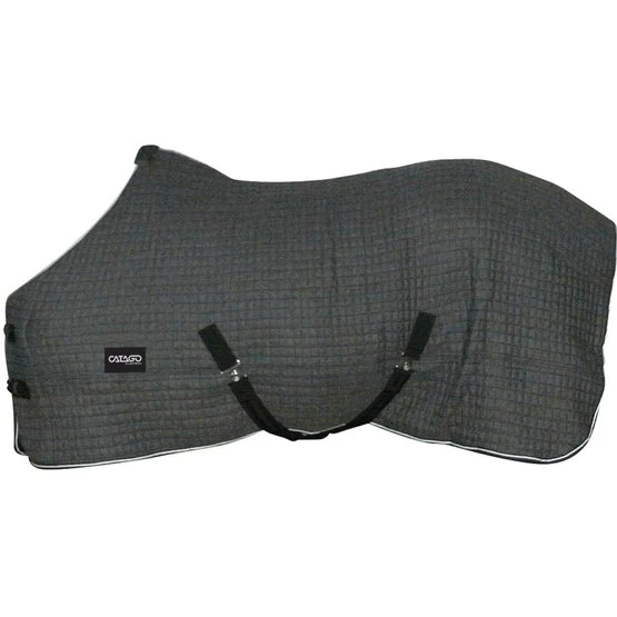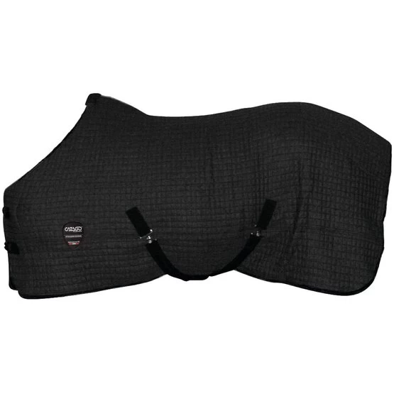 Bequemer und funktioneller Kühlteppich aus 100% Acryl mit Wolleffekt. Ideal als Transportteppich oder nach dem Training, da das Material überschüssige Wärme und Schweiß vom Pferd wegtransportiert. Der Teppich hat eine schwarze Bindung, einen doppelten Frontverschluss, abnehmbare Quergurte und elastische Beinriemen.