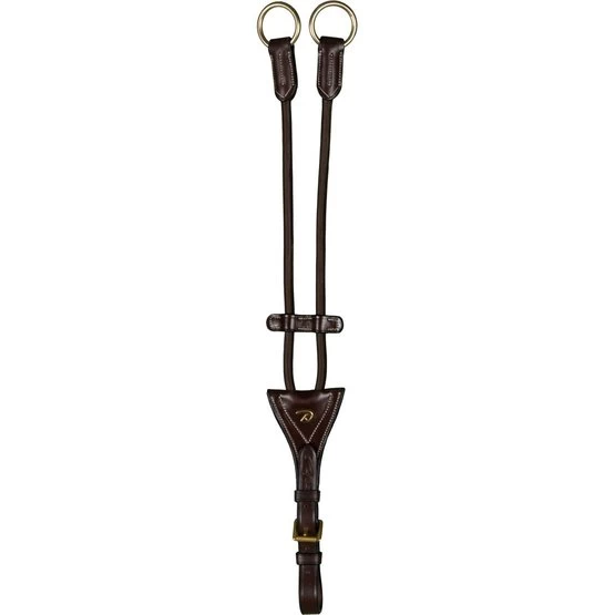 Elastischer Lauf-Martingale-Aufsatz mit rundem Gummiband, 8 mm Durchmesser und Ringen, die durch einen Lederstreifen voneinander getrennt sind, der an den Riemen auf und ab gleitet.