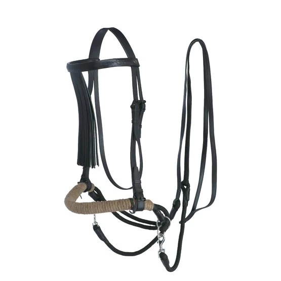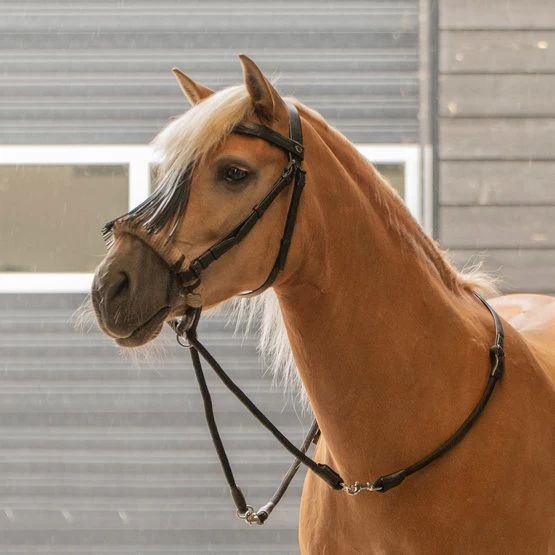 FRA Gebissloses System 4: Gebisslose Zaumzeuge sind nicht neu! Jahrhundertelang galt ein gebissloses Zaumzeug als selbstverständlich, bevor man überhaupt daran dachte, dem Pferd etwas ins Maul zu legen, legte man einfach etwas darum. Damals reichte ein Seil als Halfter und so entstand das erste gebisslose Zaumzeug. In Kombination mit Stützgewicht, Bein- und Tasthilfe hält die Reiterhand über die Zügel den Kontakt nicht mit dem Maul, sondern mit dem Kopf des Pferdes. Funktionsprinzip: Druck auf Nase und Wangen, Kinn gekreuzte Zügel. Konstruktion: Bei diesem System endet der Nasenriemen beidseitig mit einem Ring, an dem die Backenstücke und die beiden Kinnriemen im Schritt befestigt werden. Diese Riemen finden ihre Querführung durch einen Ring am Ende eines kurzen Lederstücks, das wiederum an den Ringen des Nasenriemens befestigt ist. Das Ergebnis ist, dass das kreuzweise Ganze etwas tiefer hängt als bei gekreuzten Zaumzeug (siehe System 5). Die Zügel werden an den Enden der Schrittgurte befestigt. Darüber hinaus ist dieses Zaumzeug einfach in der Ausführung aufgrund des Fehlens eines Stirnbandes, eines Kehlriemens und der Beule und Schnalle, die wir normalerweise an einem Nasenriemen finden. Auf der linken Seite befindet sich eine Schnallenverbindung in der Backe, sie ist die einzige Schnalle die benötigt wird um die Trense auf Maß zu bringen. Einmal angepasst, schieben Sie das Zaumzeug dieses Systems einfach auf den Pferdekopf und müssen danach nichts mehr befestigen. Für die FRA®-Baumwoll-Trensen aus der System 4-Serie gilt im Wesentlichen das oben Gesagte, natürlich gibt es bei dieser Trensenlinie keine Schnallenverbindungen oder sonstige lederbezogene Beschreibungen. Position: Wie bei den meisten gebisslosen Trensen erfordert auch das System 4 Trensen, dass das Nasenband auf dem harten Teil der Nase liegt, ungefähr dort, wo das Nasenbein beginnt. Die spezielle Konstruktion dieser Trensen sorgt für einen guten und festen Sitz am Pferdekopf, ohne dass etwas befestigt werden muss. Wirkung: Die Kinn-Kreuzriemen sorgen dafür, dass das Pferd beim Nachfragen nach links oder rechts Druck auf Nase und Wange auf der anderen Seite bekommt und dann der Reiterhand folgt: dreht sich durch Druck. Gleichzeitiges Anhalten an beiden Zügeln schließt das Nasenband und bietet Möglichkeiten zum Anhalten oder Tempowechsel. Die oben erwähnte Frage nach dem linken, rechten oder beiden Zügel hat aufgrund der indirekten Zügel immer eine gewisse Dosierung, die den Grad der diskriminierenden Wirkung bestimmt. Als Ergebnis wird eine gewünschte Änderung des Diskriminierungsgrades immer einen glatten Effekt haben. Natürlich werden Zügelhilfen mit anderen Stützhilfen unterstützt. Der Verbindungsriemen, der die Zügelführung mit dem Nasenriemen und dem Backenstück verbindet, sorgt für eine tiefe Position und freien Durchgang der gekreuzten Kinnschrittriemen, was die Auslösung stark verbessert. Besondere Aufmerksamkeit muss bei dieser Art von Zaumzeug immer der Pflege der gekreuzten Kinnriemen geschenkt werden, die richtige Pflege gibt dem Leder die Flexibilität, die richtige Freigabe in den Ringen dauerhaft zu erfahren. Das Zaumzeug eignet sich nicht zum Longieren mit dem Einzellonge und daher nicht zum Longieren von Pessoa. Zum Longieren auf den Doppelleinen nehmen Sie die Zügel ab und verwenden Sie die gelösten Ringe, um die langen Leinen zu befestigen. Eignung: Das Zaumzeug wird in Kombination mit leichtem Zügelkontakt verwendet und ist sehr gut für sensible Pferde geeignet. Dadurch eignet sich das Zaumzeug auch besonders für junge zu reitende Pferde und sensible Tiere mit Bluthochdruck In dieser Kategorie kann das Zaumzeug auch als Fahrzaum verwendet werden. Neben der Tatsache, dass das Zaumzeug als Führhalfter verwendet werden kann, bietet es auch volle Mundfreiheit, was bei Outdoor-Ausritten seinen Vorteil bieten kann.