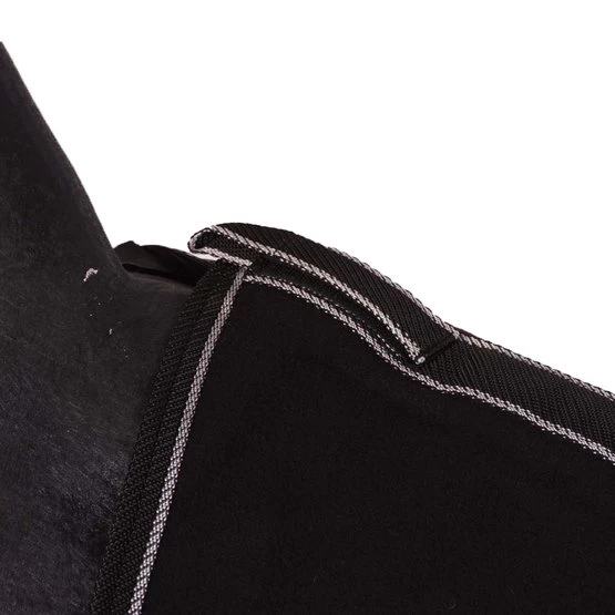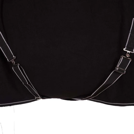 Fleecedecke mit einem festen Halsteil, mit elastischen und abnehmbaren Gurtbändern. Die Decke besitzt einen Schweifriemen und einen doppelten Brustverschluss und besteht aus 100% Polyester-Microfleece.