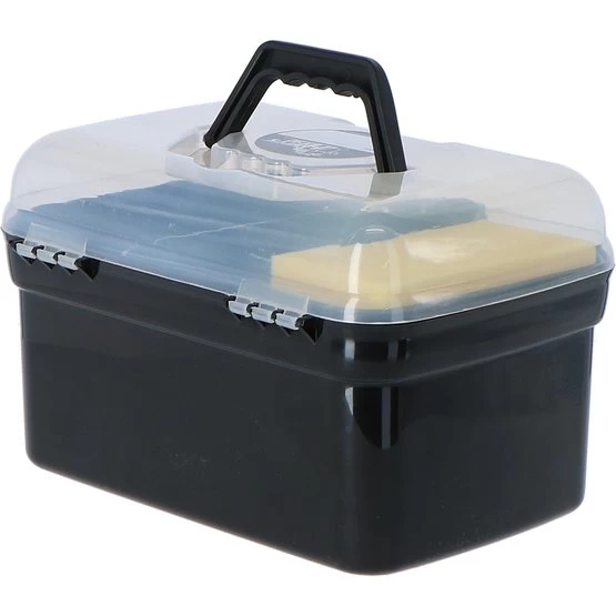 Inhalt: Hufkratzer mit Bürste, Glanzbürste, harte Bürste, Kardätsche mit Glitzer, Schwamm und Mähnekamm