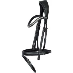 Leder, extra weiche Trense mit anatomischem Genickstück. Dieses Zaumzeug hat schöne Kristalle am Stirnband. Ein komfortables Zaumzeug kann sicherlich zu mehr Komfort für das Pferd und damit zu einer verbesserten Leistung beitragen. Lieferung mit hängendem Stirnband. Dies trägt zu einem verringerten Druck an den Ohren des Pferdes bei. Der Nasenriemen ist 2,7 cm breit, inklusive Polsterung. Blindverschlüsse an Backenstücken und Zügeln. Das Zaumzeug wird mit Webzügeln geliefert.