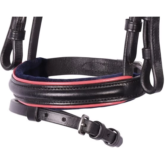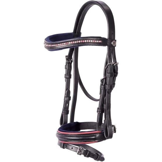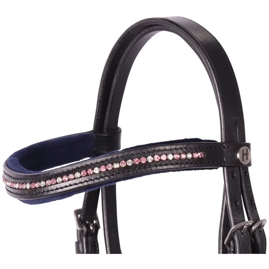 Luxuriöse Trense mit 4 verschiedenfarbigen Kristallen im Stirnband, Nasenriemen mit Paspelierung und weicher Polsterung, Blindverschluss an Backenstücken und Zügeln. Inklusive Gurtzügel mit Stoppern.