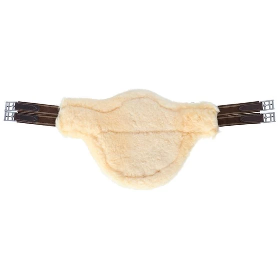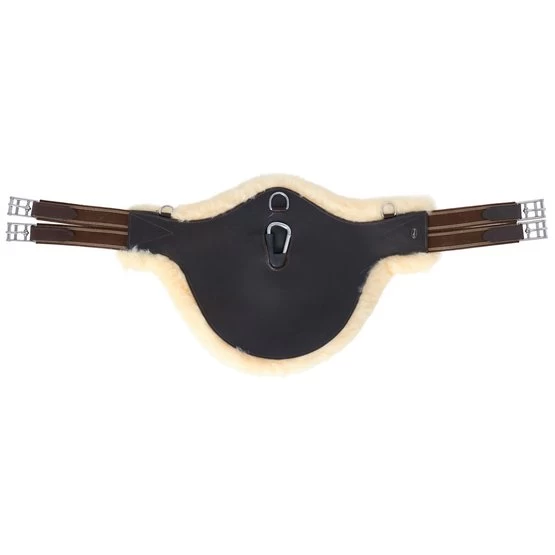 Anatomisch geformter Lederumfang für Frühlingssättel, mit Schaffell gefüttert. – mit beidseitig elastischem Bauchschutz – Rollschnallen aus Edelstahl – Fellfutter mit Klettverschluss unter der Bauchklappe – mit Befestigungsringen für die Zügel