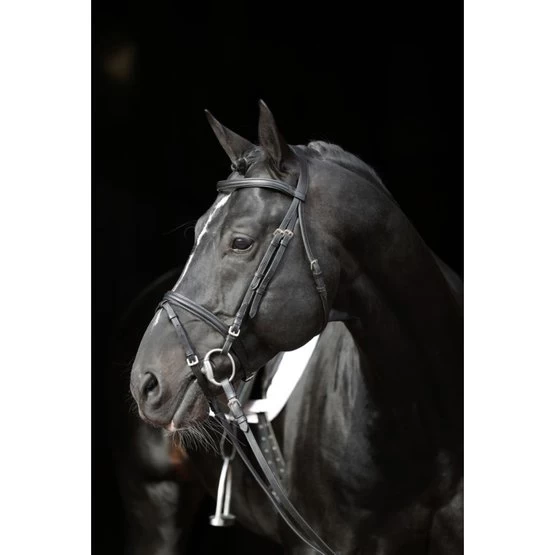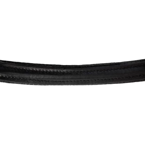 Der Trensenzaum Standart wurde aus schwarzem Leder handgenäht und wird inklusive Gurtzügel versendet.