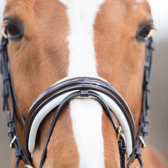 ● braun/braune Nähte, Nasenriemen mit braunem Lackleder und weißem Futter, mit Messingschnallen