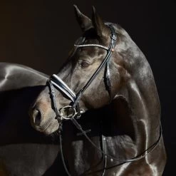 Rundstichelemente, der konisch geformte Nasenriemen und ein glitzernder, mit Kristallen besetzter Stirnriemen machen diese Trense zu einem Hingucker. Das Zaumzeug Silvie II ist mit oder ohne Lacklederfutter in Schwarz oder Weiß erhältlich und wird mit einem wunderschönen geschwungenen Stirnband geliefert, das mit Kieffer Ultrashine®-Kristallen in der Farbkombination Ihrer Wahl verziert ist.