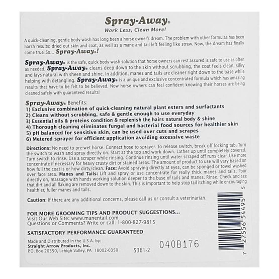 Das Spray Away Shampoo ist eine exklusive Kombination von schnellreinigenden, natürlichen, pflanzenartigen Stoffen, die das Fell und Haar reinigen und für mehr Glanz und Volumen sorgen. Der Artikel reinigt gründlich ohne zu scheuern. Die hinzugefügten Öle und Proteine sorgen für eine schnelle Regeneration und verbessern den natürlichen Glanz.