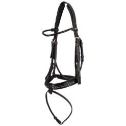 Trensenzaum mit unterlegtem anatomischem Genickstück und rundgenähtem Stirnriemen. Breiter, vollständig unterlegter Nasenriemen mit Sattelziernaht, lackierter Zierpaspel und Noseband. Die untere Schnalle des Nasenriemens ist mit einem abnehmbaren elastischen Lederpolster versehen. Die Schnallen der Backenstücke sind mit einem Gummieinsatz versehen, damit das Gebiss nicht auf den Laden des Pferdes aufliegt. Ohne Zügel.