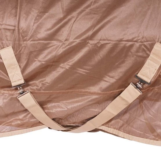 • Das feste Halsteil hat einen Befestigungsriemen mit Klett an der Oberseite zur Befestigung einer Fliegenmaske