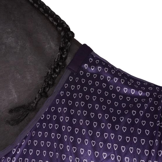 Leichte Fliegendecke mit Herzchenprint, mit doppeltem Frontverschluss, Kreuzgurten mit Elastik und Schweifkordel. Passend zu allen Artikeln der Waldhausen Lucky Heart Serie.